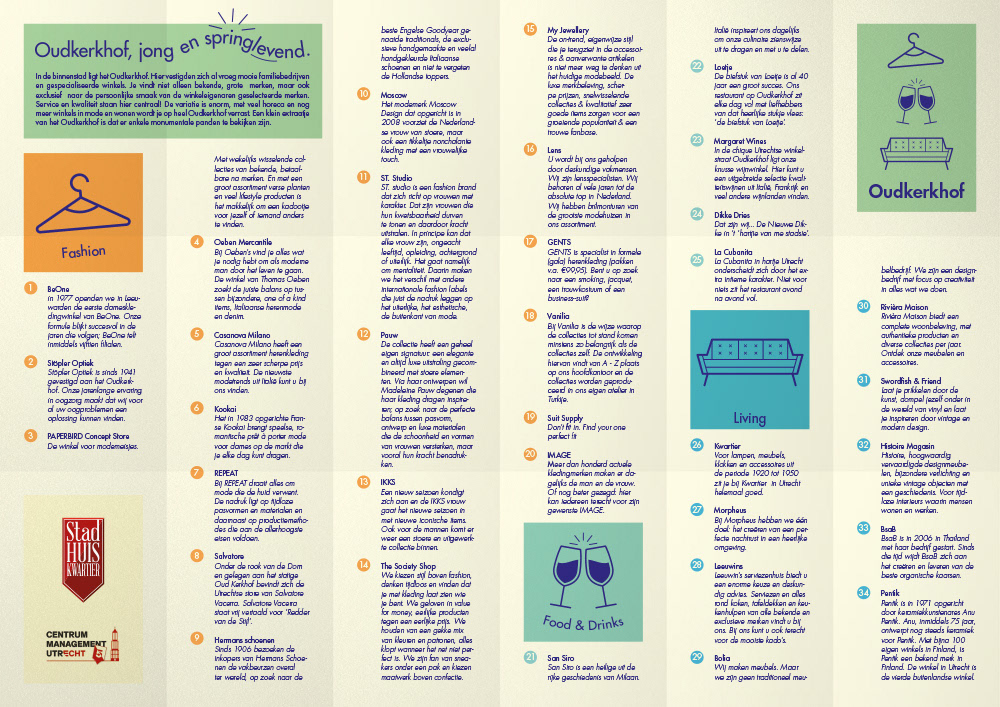 For Utrecht' shopping district Oudkerkhof I designed this pocket sized shopping map. On one side an overview of all the shops, restaurants and cafe's located at the shopping district. On the other side an illustrated map of Oudkerkhof and its surroundings.